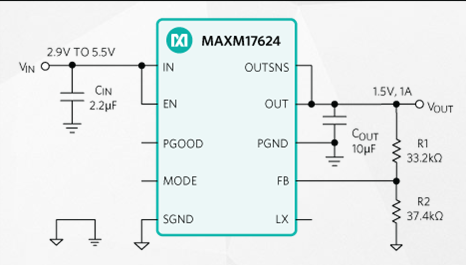 MAXM17623和MAXM17624模塊在穩(wěn)態(tài)工作時(shí)采用峰值電流模式控制方法。為降低輸入浪涌電流,器件提供1ms固定軟啟動(dòng)時(shí)間。兩款模塊均可選擇輕載時(shí)采用PWM或PFM模式。選擇PWM模式時(shí),MAXM17623工作在固定2MHz開關(guān)頻率,MAXM17624工作在固定4MHz開關(guān)頻率。MAXM17623提供0.8V至1.5V輸出電壓,MAXM17624提供1.5V至3.3V輸出電壓。